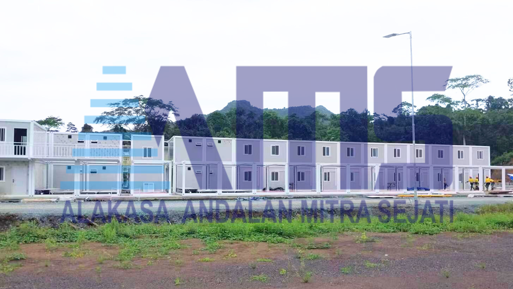 Terletak di Sumbawa, jauh dari pusat kota, Prefabricated Container House mampu menjadi solusi kebutuhan pertambangan. Proses konstruksi yang mudah, cepat dan tidak meninggalkan banyak sisa material sehingga tidak mengganggu mobilitas pekerjaan tambang. Dibangun dengan dua lantai, dengan kostumisasi cat warna kuning pada bagian bagian pagar.