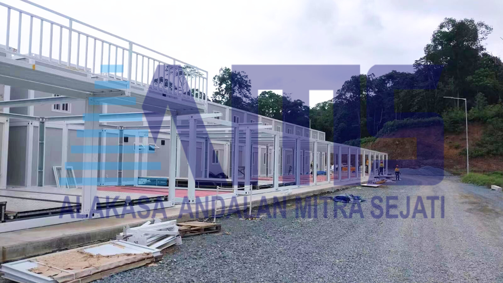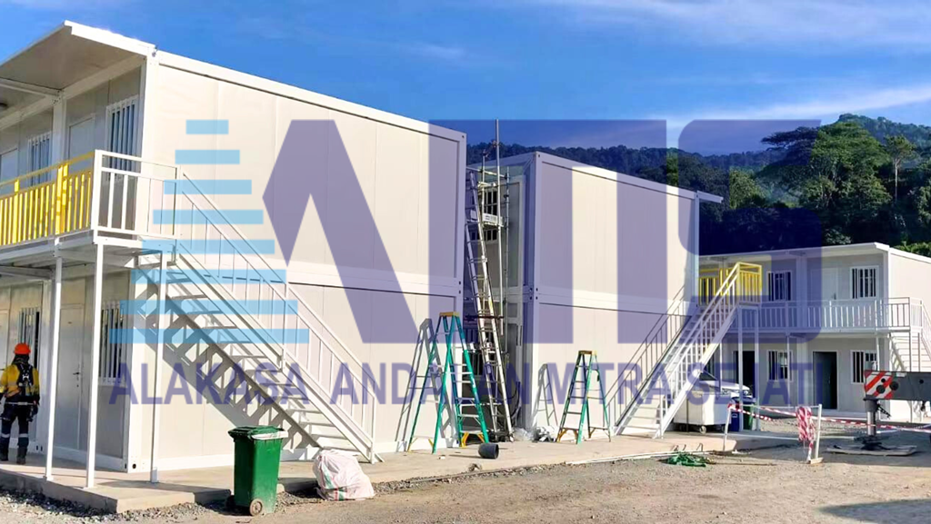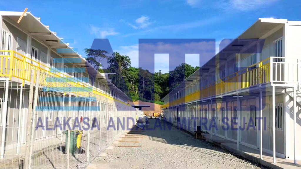 Terletak di Sumbawa, jauh dari pusat kota, Prefabricated Container House mampu menjadi solusi kebutuhan pertambangan. Proses konstruksi yang mudah, cepat dan tidak meninggalkan banyak sisa material sehingga tidak mengganggu mobilitas pekerjaan tambang. Dibangun dengan dua lantai, dengan kostumisasi cat warna kuning pada bagian bagian pagar.